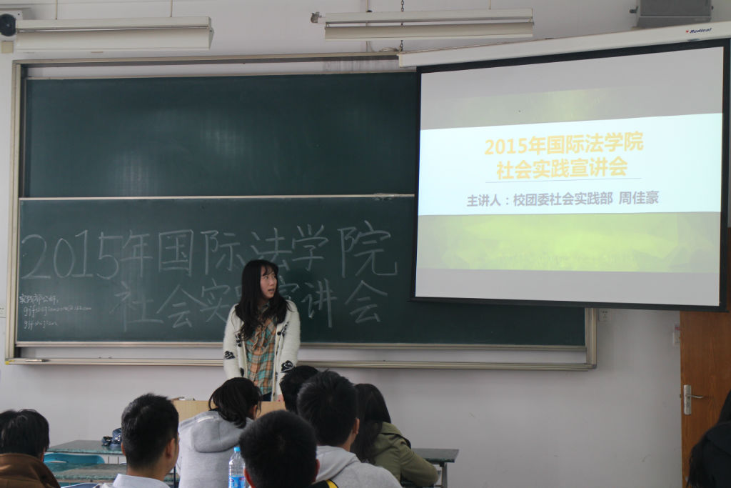 2015年4月14日,国际法学院社会实践宣讲会在主教219A顺利举行,校团委社会实践部副部长周佳豪应邀出席并担任主讲嘉宾。本次宣讲会向同学介绍了我校社会实践的现状以及国际法学院近年来各个社会实践项目的开展情况,目的在于启发同学们寻找新的社会实践方向。