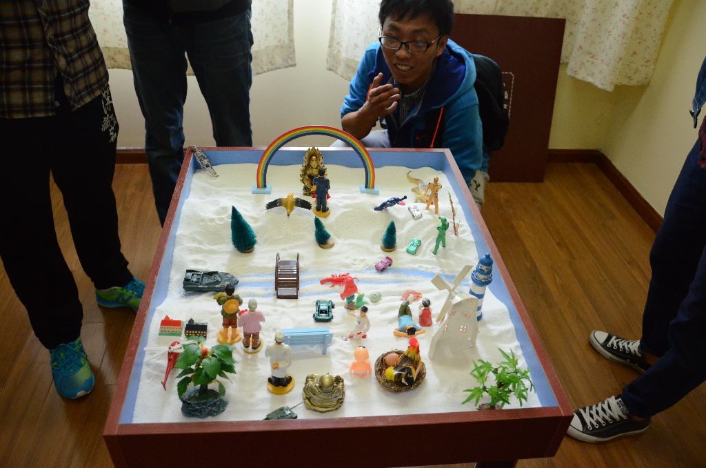 沙盘游戏室是心理健康小组参观学习的最后一个场所,这也是最主要的一个学习体验环节。在龙老师的建议下,小组成员进行一次集体沙盘游戏。在一轮沙盘游戏结束之后,王老师对每个参与沙盘游戏的小组成员进行提问交流,然后王老师从专业的心理学角度对每位成员心理、性格做了简短的分析,这使第一次接触这类活动的小组成员感到既紧张又有趣。