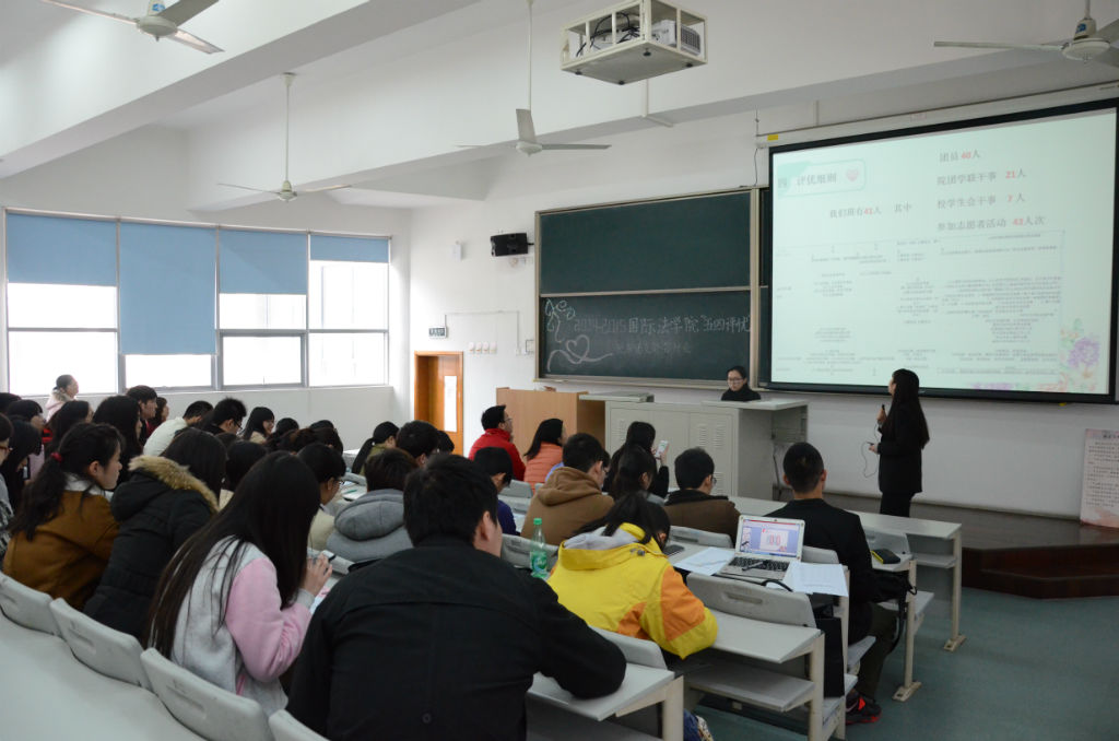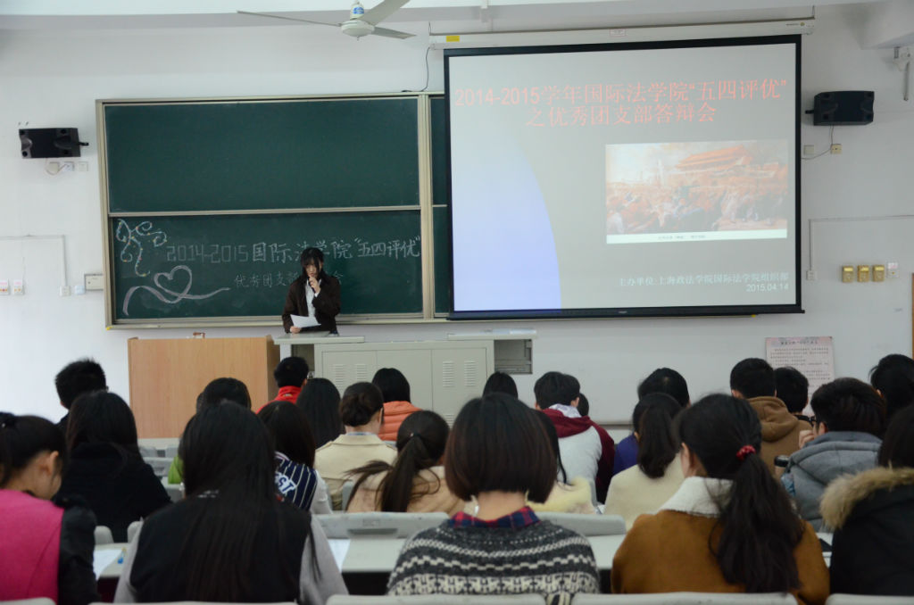 2015年4月14日,国际法学院“五四”优秀团支部评选答辩会在主教401B举办。 国际法学院团总支书记唐胜楠、团总支副书记薛诗仪、沈珮及各班优秀团员代表应邀参加本次答辩会并担任评委。