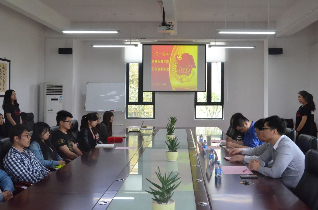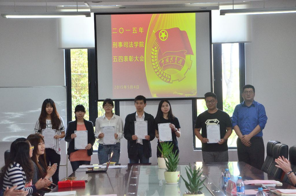 为弘扬五四精神,表彰先进个人,5月4日中午十二时许,刑事司法学院在法学楼B3-101举行2014至2015年度五四表彰大会。出席本次大会的嘉宾有刑事司法学院党总支书记贾洛川、校团委书记陆嵬、刑事司法学院院长助理徐海琨、刑事司法学院团总支书记谢玮洁。刑事司法学院“ICC中英文赛”代表队、青年标兵、优秀团干、优秀团员代表参加此次会议。
