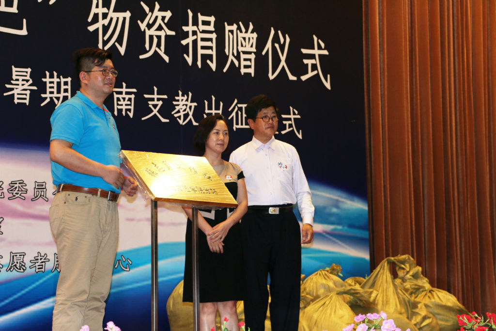 随后的仪式中,干警志愿者代表上台捐赠物资,校团委书记陆嵬代表新利18官方客服与张志勇先生进行签约并同刑事司法学院党总支书记胡冠时共同为张志勇志愿服务社新利18官方客服分社揭牌。校团委书记陆嵬老师还为即将参加暑期实践赴云南支教的蓝盾志愿者们授旗。