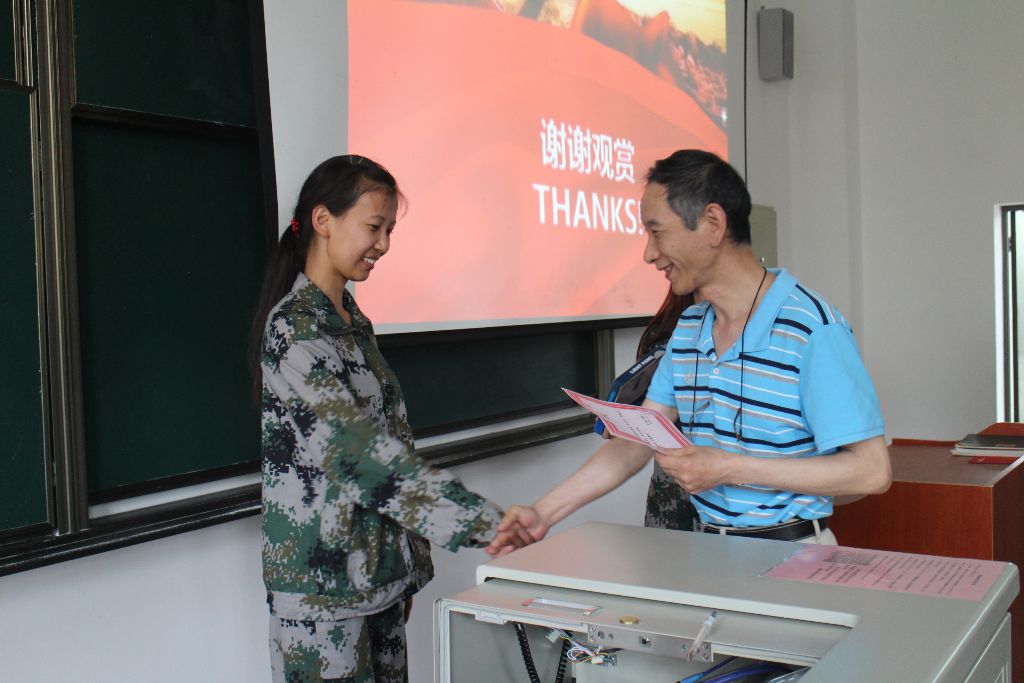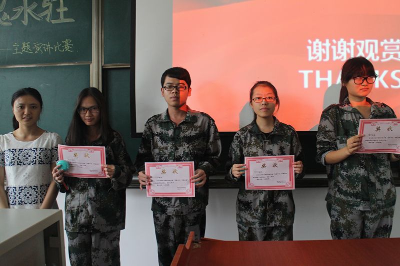 在主持人宣布了比赛规则和评分细则后,比赛正式开始。参赛选手们逐一上台,阐述自己对演讲主题的理解。在“唱出青春的美好,唱出军魂的力量”、“军训是什么”、“迷彩色的青春”等演讲中,同学们文采飞扬,在演讲中注入深刻的感情,在比赛中表现出或许诙谐幽默或许俨然正气的台风,自信地表达着自己对军训和青春的理解。他们都无一例外的提到了对成长的思想和对教官的感谢,以及即使军训辛苦,也同样体味欢乐、收获成果。选手演讲结束后,谈青老师进行了专业点评,他表示在同学们的演讲中感受到了青春活力,同时也指出了同学们演讲中内容及形式的不足,并向在座的各位讲述了当年军训的趣事。紧接着比赛进入颁奖环节,比赛结果分为4个不同奖项,最终获得一等奖的是孙夕雅同学和曹雪娇同学,场上的阵阵掌声表达了大家对所有获奖同学最真挚的祝贺。随后,教官代表上台讲话,言语虽然简单朴实,却对于同学们有巨大的感召力。