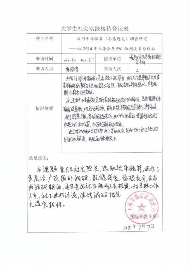 项目组于2015年6月末至7月初的调研得到了嘉定区司法局菊园新区司法所和浦东新区检察院的大力配合。调研过程中项目组向社区矫正的专职工作人员、小组成员及志愿者进行了沟通,获悉了2名服刑人员的资料和他们的社区矫正情况。7月至8月初,通过与检察院检察官的访谈交流和以申领者身份在多家银行的走访调研,项目组了解到了信用卡诈骗的现状以及产生这种情况的几个主要原因。