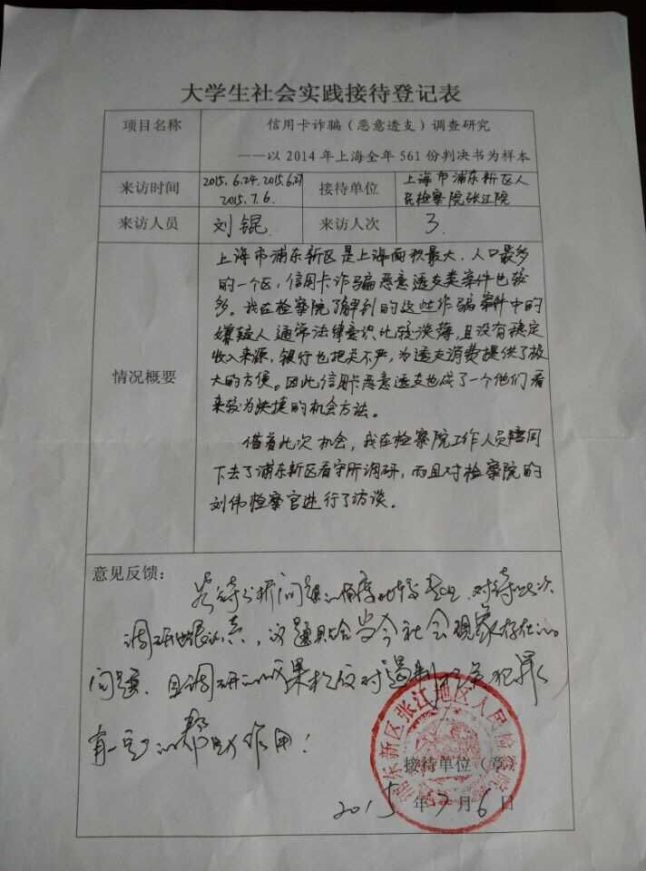 2015年6月末至8月,法律学院学生针对信用卡恶意透支严重危害社会的现象,组成项目小组,开展对信用卡诈骗恶意透支案件高发现象、原因、审判现状及其防范措施的一系列调查研究活动。