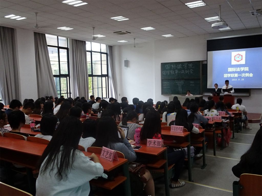 2015年9月29日下午,由国际法学院举办的新一届团学联第一次例会于B4-105顺利举办。例会邀请了上届团学联主要成员作为代表出席,本届团学联全体成员参与本次例会。
