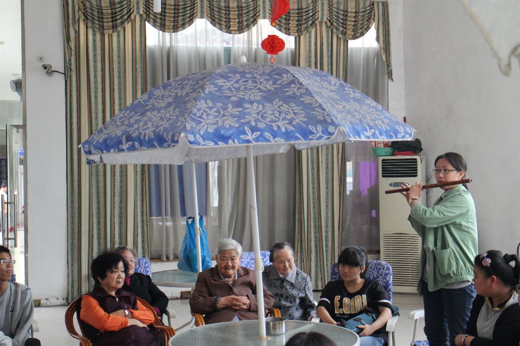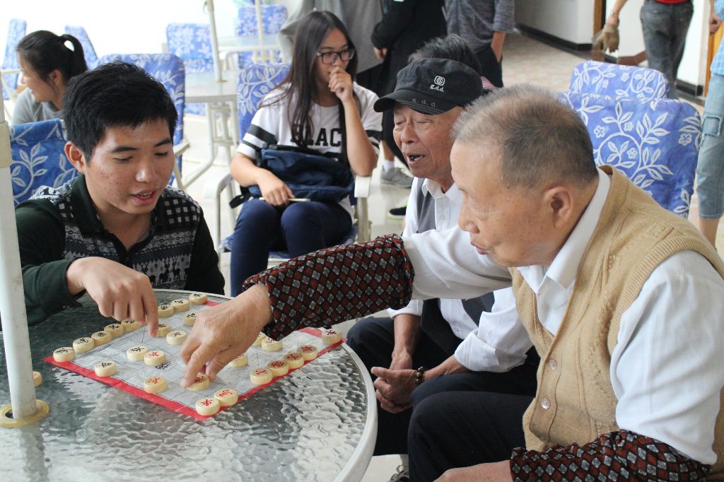 首先大家拜访了一位75岁的视力障碍老人。据悉知,该老人是上海科技大学的一位退休教师,来养老院已有八个月了。他说自己独自在房间里时常收听医药类和老年节目,并和同学们交流了当年教书经历中的趣事。随后在养老院大厅里,几位男生陪爷爷一同下象棋,一些爷爷奶奶们给大家分享了年轻时工作的经历及态度,他们表示每个人学习、工作中要和气待人,要秉持着“礼”和“理”做人,并在讲述自己当年的艰苦求学经历时教导同学们好好学习,让在场的同学受益颇多。最后,同学们给老人们表演了竹笛演奏以及合唱等精心准备的节目,表演时老人们纷纷轻声和音,场面其乐融融。