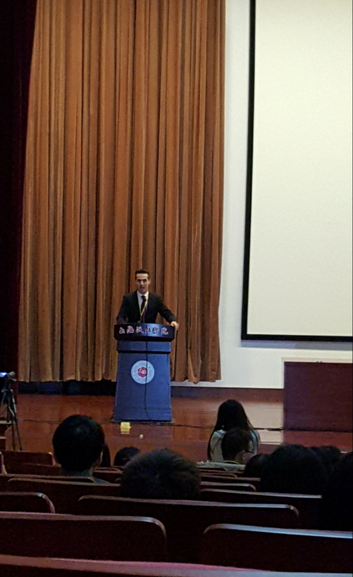 接着,国务学院院长王伟民先生用英语进行致辞。周秋君博士对代表们进行表扬并对世界政治形势进行分析。