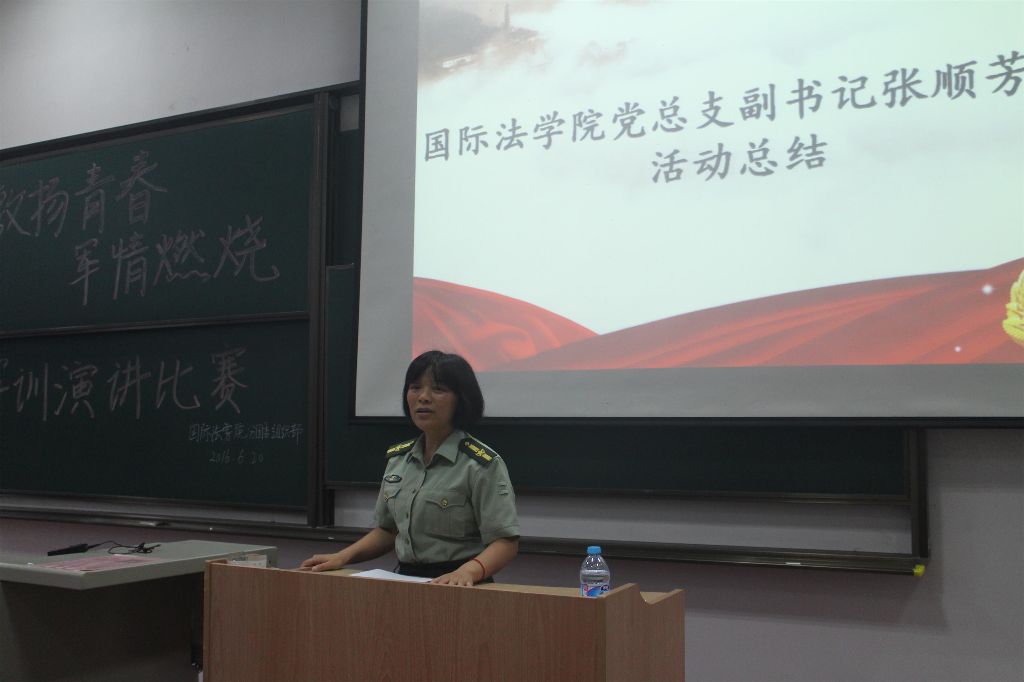 国际法学院成功于6月20日下午14点45分在法学楼B4-104举办“激扬青春,军情燃烧”军训演讲比赛。党总支副书记张顺芳老师,团总支书记唐胜楠老师,学生辅导员张熙老师和四营营长王教官,林教官等6名教官出席本次演讲比赛并担任评委。