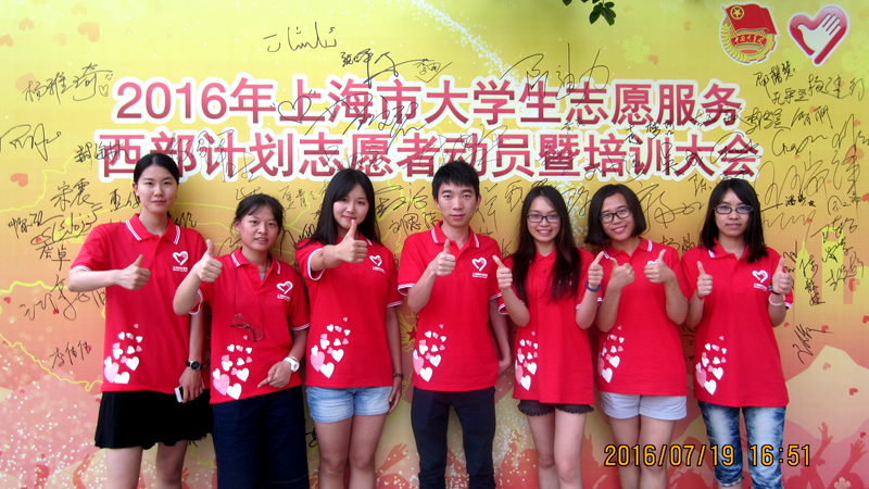 7月19日下午,2016年上海市大学生西部计划志愿者出征仪式在上海青年管理干部学院举行。来自全市41所高校的114名青年志愿者,即将陆续启程前往新疆、西藏、云南、重庆等中西部省市区开展志愿服务工作。我校来自经济法学院、国际事务与公共管理学院、刑事司法学院、高职学院和国际法学院等5个学院共10名志愿者将代表学校奔赴祖国西部地区进行为期1-3年的支教、支医、支农等志愿服务活动。