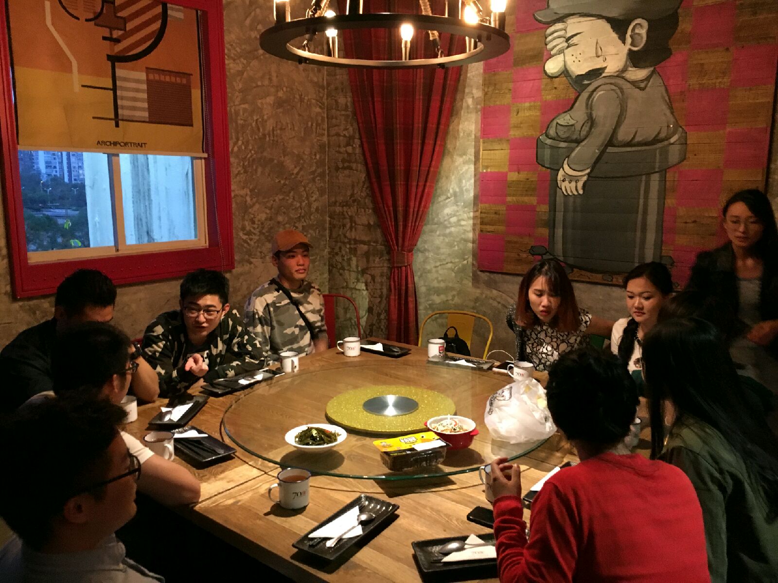 傍晚时分,同学们累了也饿了。我们分成几个小分队出发去吃饭的地方,饭桌上大家畅所欲言,说着各自本科时候的趣事,聊着今天上午游上政的感受。