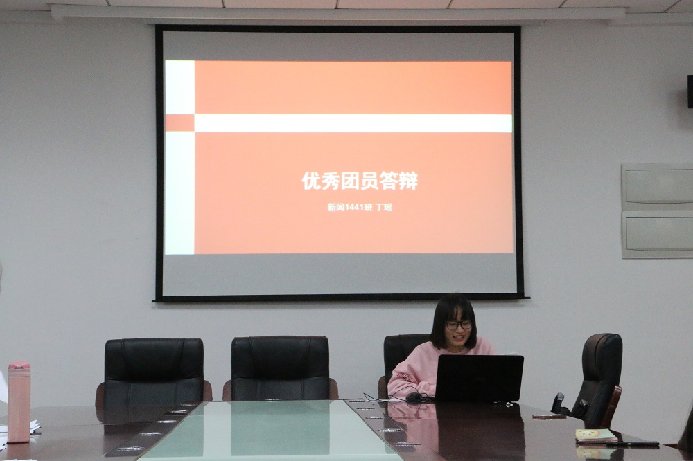 答辩开始,每位候选人根据自己的学习情况、思想情况、生活情况、获奖情况等多方面展开,依次答辩。在过程中,优秀团员候选人讲述自己的经历,成长生活和人生感悟。有多位团员表现突出,获得了在场评委和优秀团员候选人的好评。广播电视学1541孙问同学曾获得过文学与传媒学院“志愿之星”、2016年文学与传媒学院军训“优秀学员”等多项奖项,在大一新生中,新闻1641的曲仪同学以成长为题,讲述了自己在大学的经历,从什么社团都想加到最后明确自己想要什么的蜕变过程。