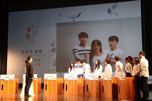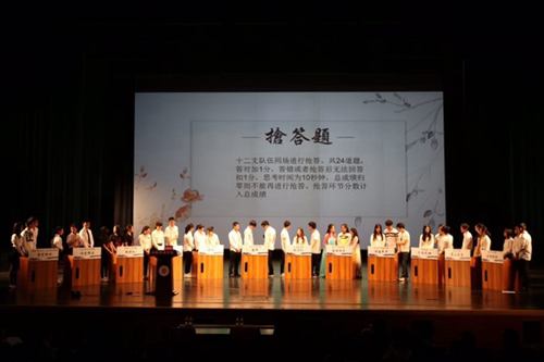 诗词大会的比赛一共分为三个部分,由必答环节、抢答环节以及飞花令环节组成,十二个学院的参赛队伍根据各环节所得分数决出冠亚季军。飞花令是我国古代文人所创的一种行酒令,飞花令属雅令,比较高雅,所以,这种酒令也就成了文人墨客们的最爱。