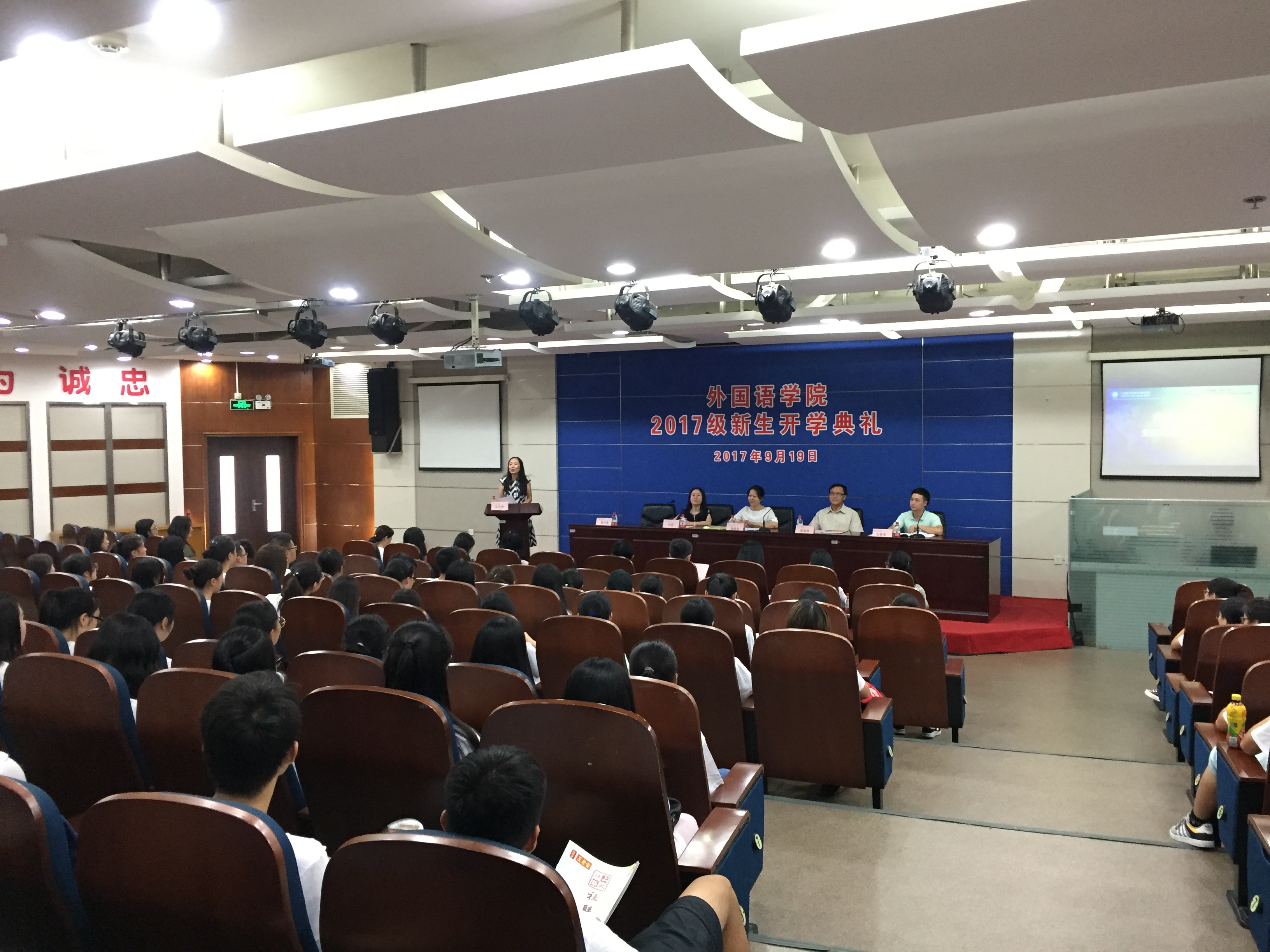 9月19日下午,外国语学院2017级新生开学典礼在庸夫楼112隆重举行。外国语学院2017级123名新生参加了开学典礼。外国语学院党总支书记姚善英、院长张本梓、副院长夏甘霖、英语专业教研室、俄语专业教研室各位老师、新生辅导员等出席。开学典礼由副院长夏甘霖主持。