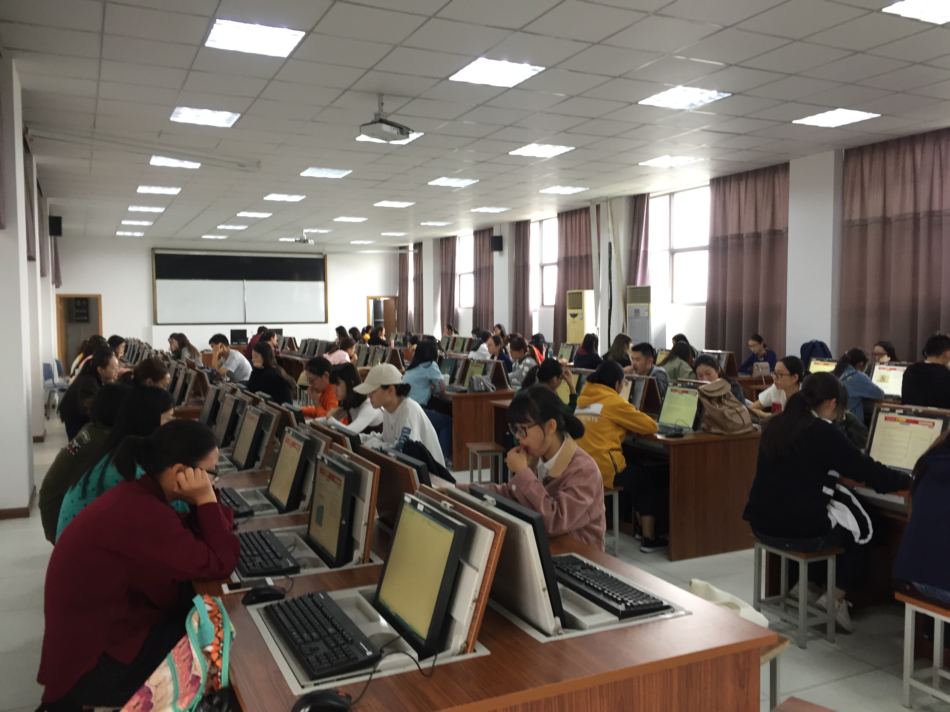 10月14日,根据大赛主办方的要求和规定,我校的阅读大赛和写作大赛在学校5个计算机房通过主办方的官方测试平台在线举行。外语学院监考的教师在教务处实验室管理科技术人员的帮助下,一方面积极排除故障,另一方面和主办方保持有效沟通,保证了比赛顺利进行,确保了我校所有到场参赛学生完成答题并获得有效的成绩。今年我校有415名学生参加了写作大赛初赛,456名学生参加了阅读大赛的初赛。