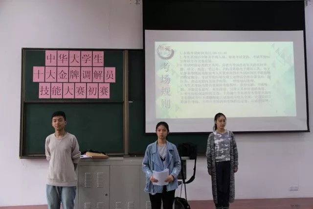 10月17日 下午1点,由法律学院学术部主办的中华大学生十大金牌调解员技能大赛赛前选拔初赛在B4-204、B4-207顺利开展,我校众多同学前来参加,学术部部长吴婧担任了本场比赛的主持人。