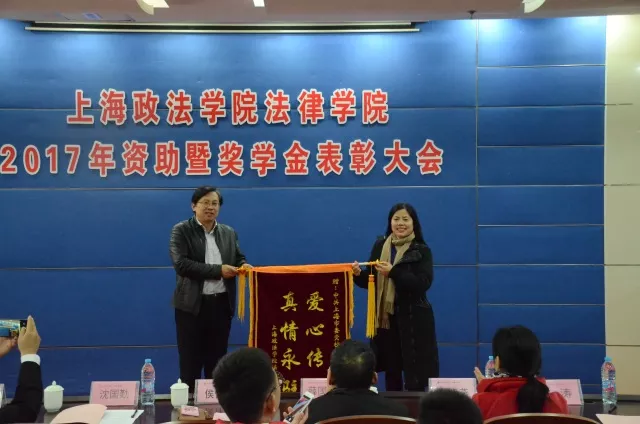 会议伊始,法律学院辅导员王娟介绍了2017年法律学院奖学金的评审情况。随后,法律学院辅导员申迪介绍了中共上海市委党校第二分校与法律学院困难学生结对情况,并由法律学院院长侯怀霞向中共上海市委党校第二分校党支部赠送锦旗。