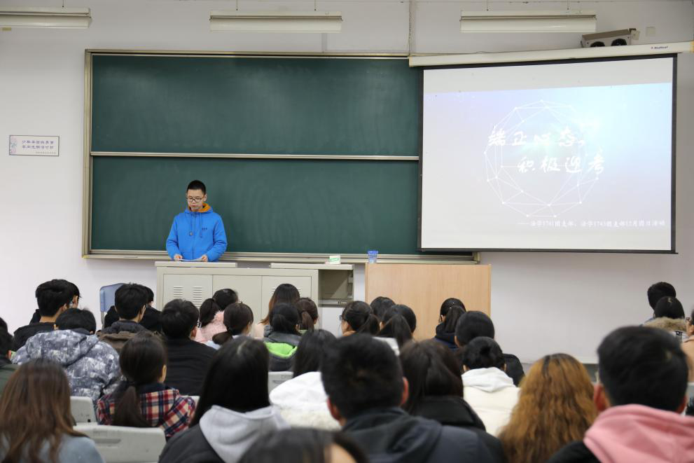 12月14日上午10点,刑事司法学院法学1741团支部和刑事司法学院法学1743团支部联合举办的“端正心态,积极应考”主题团日活动在主教楼103A教室顺利开展。本次活动十分荣幸地邀请到了刑事司法学院团委书记王双老师、辅导员李洋老师、导生陈丹彤学姐和徐轶凡学长。活动由法学1743团支书严正宇主持,两个团支部的106名同学全员出席。