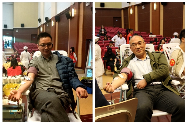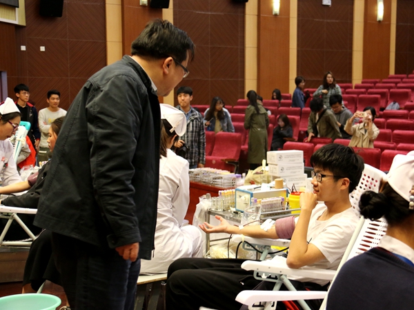 在献血的人群中,有献血14次,献血量占成人血量65%的资产与设备管理处副处长彭辉老师,有一边护送学生献血、一边自己捋袖的辅导员郭平老师。有在会议后赶到献血点,献完血又接着去工作的肖诗来老师。他们通过行动既带给学生勇气,又为无偿献血工作奉献自己的力量。