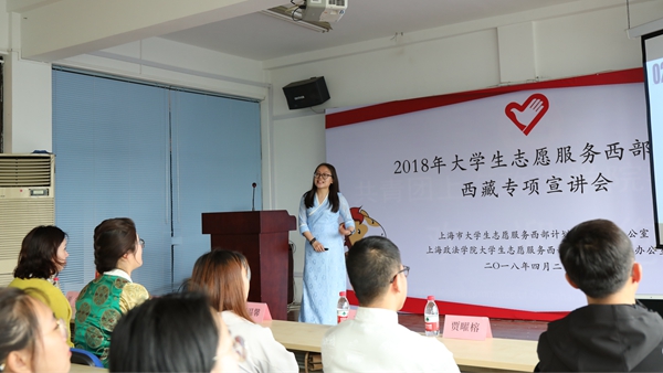 宣讲会在校团委副书记朱慧博的致辞中拉开帷幕。近年来,我校大力宣传、积极组织应届毕业生服务西部计划,四年内获得三次全国绩效优秀,仅2017年就有19名志愿者成功参加西部计划,达到全市志愿者规模的17%,赴藏志愿者罗淞被评为上海市对口支援与合作交流工作先进个人,赴疆志愿者尹建亚为“漏斗胸”男孩发起沪疆爱心接力,在团市委和儿童医院的助力下,患儿抵沪成功手术,家庭因此脱贫重生。她指出,西部计划工作是我校服务西部、锻炼培养我校学生的重要渠道,希望更多应届毕业生积极投身西部建设,到基层、到祖国最需要的地方去,争做一名有温度、有担当的上政人。