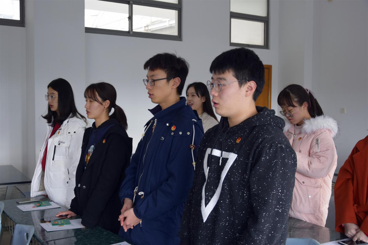仪式在激昂的国歌声中开始,首先由各团支部的团支书为4名新团员颁发团员证并佩戴团徽。随后主持人桂旖旎带领新团员进行庄重的入团宣誓。新团员们举起右拳,庄严宣誓,铿锵有力的话语表达了他们积极向团组织靠拢的决心。