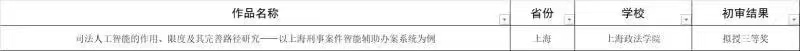 目前,第十七届“挑战杯”全国大学生课外学术科技作品竞赛初审工作已顺利完成。由我校人工智能法学院报送,吴惟予老师、颜涵老师、马亮老师指导,2019级本科生陈宁豫、戴艺非、吴之婧、范雨萱参与的哲学社会科学类社会调查报告类项目《司法人工智能的作用、限度及其完善路径研究——以上海刑事案件智能辅助办案系统为例》 荣获国赛三等奖。