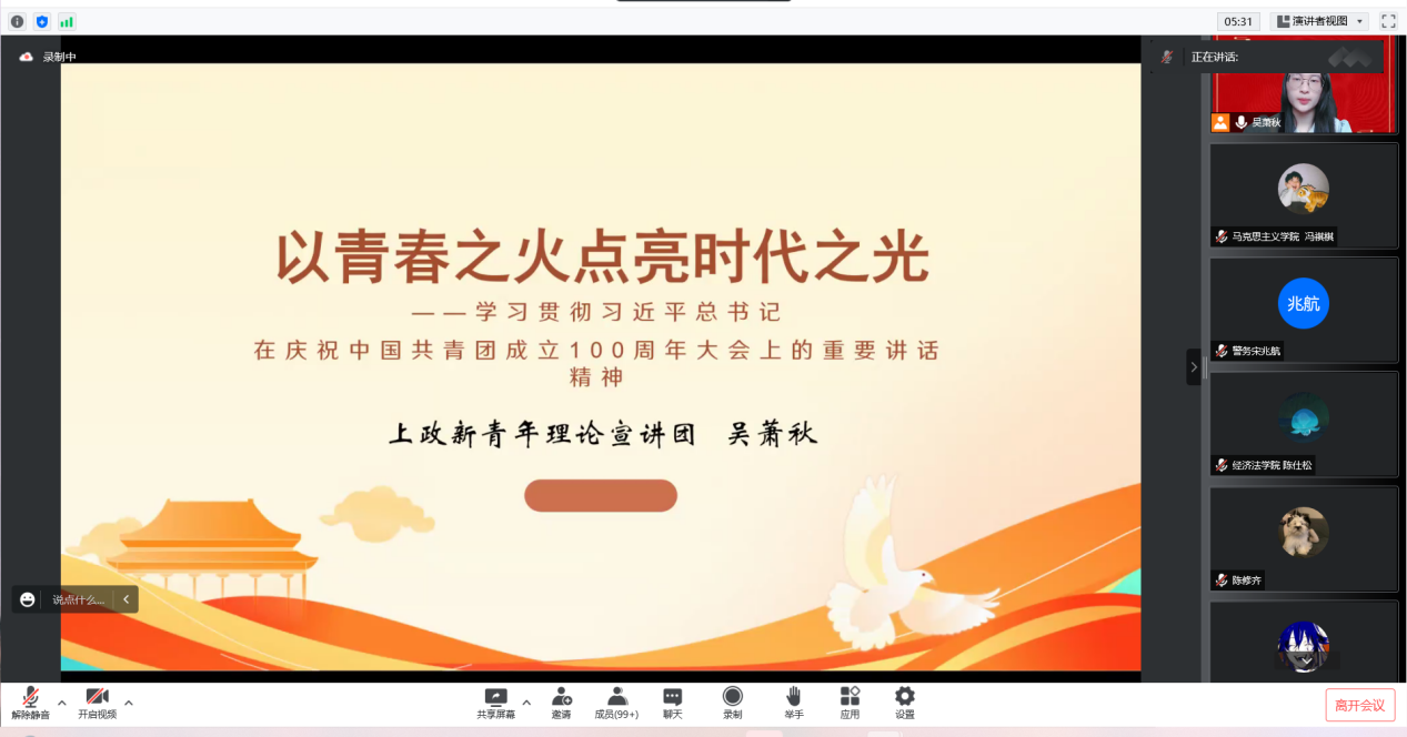 主讲人吴萧秋同学紧紧围绕习近平总书记在庆祝中国共青团成立100周年大会上重要讲话的内容,从“回望历史:中国青年百年求索之路”、“把握现在:当代青年勇担历史使命”、“展望未来:青春力量续写时代荣光”三个方面展开本次宣讲,带领各团员青年重温团史,了解使命,筑梦未来。