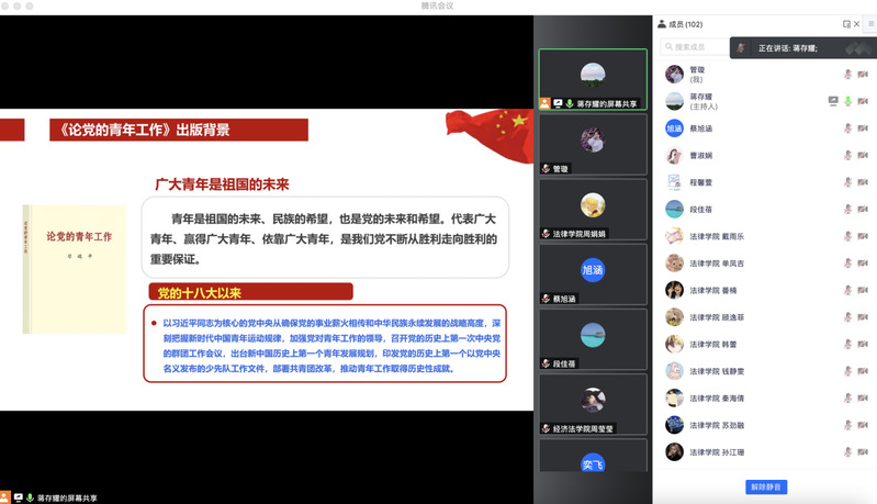 为进一步学习贯彻落实习近平总书记在庆祝中国共产主义青年团成立100周年大会上的重要讲话精神、习近平总书记关于青年的重要指示批示精神以及给青年的回信精神,体悟习近平总书记的殷切期望,7月21日上午,校团委以腾讯会议形式举办《论党的青年工作》线上学习导读活动,全体校团委委员、校团委班子成员、各学院团委书记、校院两级学生骨干参加了活动。