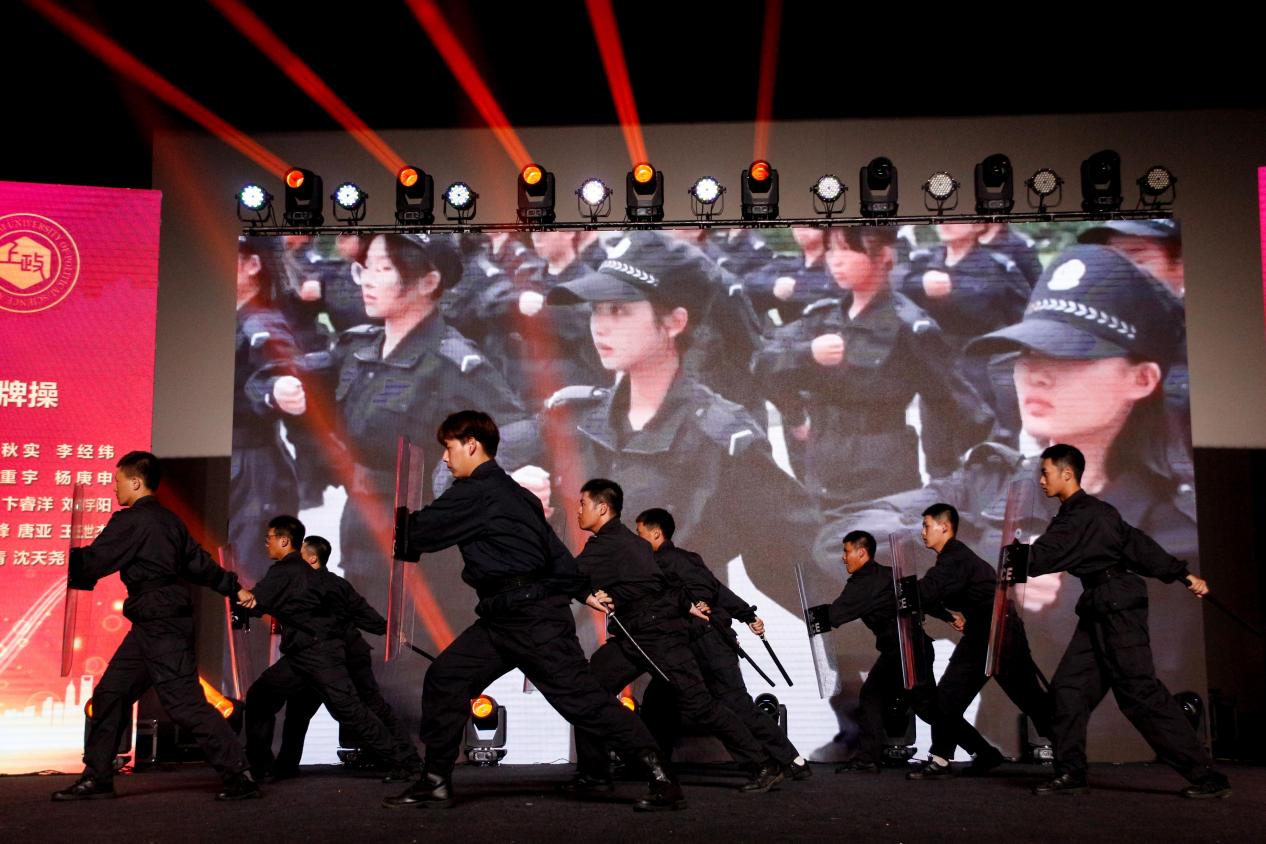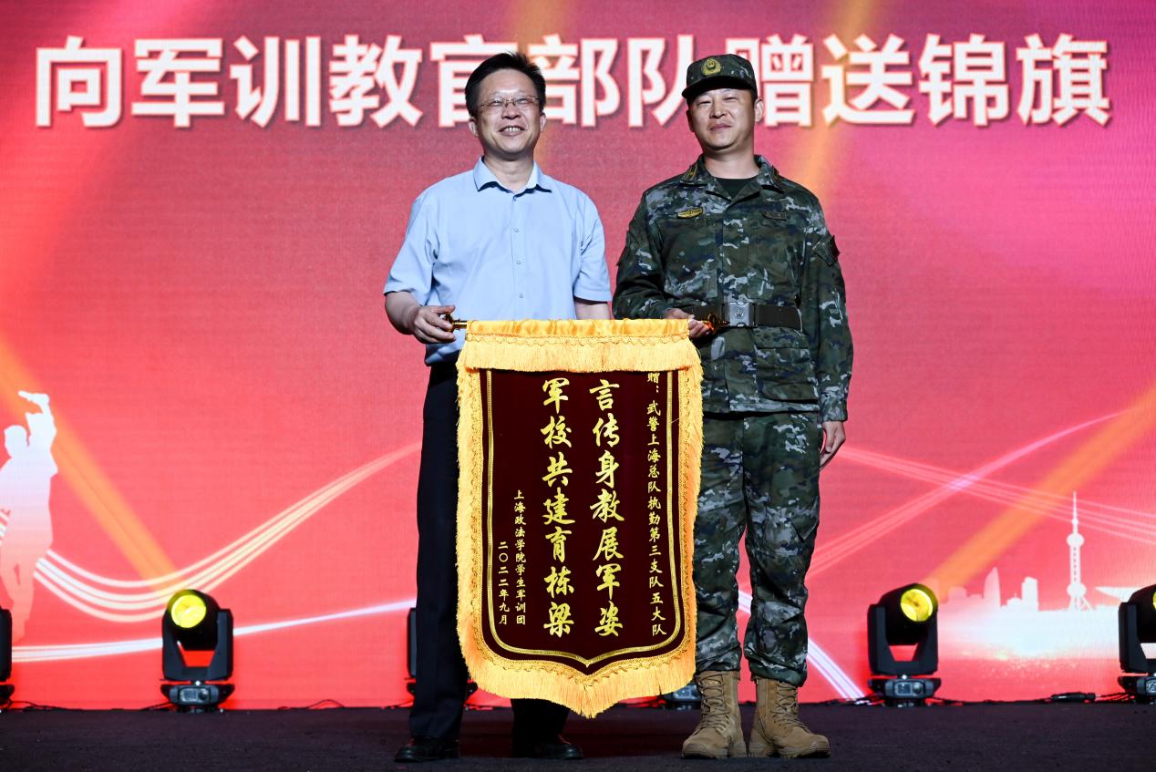 此后,学校对本次军训锦年奖获得者和优秀教官进行表彰,激励更多上政学子争做时代先锋,罗立刚向武警上海总队执勤三支队五大队授锦旗。正值全场气氛热烈,由上政师生代表倾情演绎的《理想照耀中国》MV首次发布,将晚会推向高潮,献礼党的二十大。