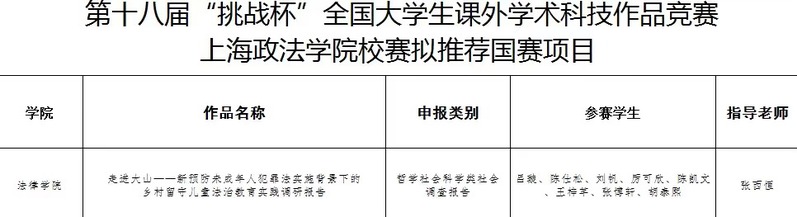 根据国赛申报工作安排,拟推荐项目《走进大山——新预防未成年人犯罪法实施背景下乡村留守儿童法治教育实践调研报告》代表新利18官方客服参加第十八届“挑战杯”全国大学生课外学术科技作品竞赛,根据评选工作有关程序,名单公示如下: