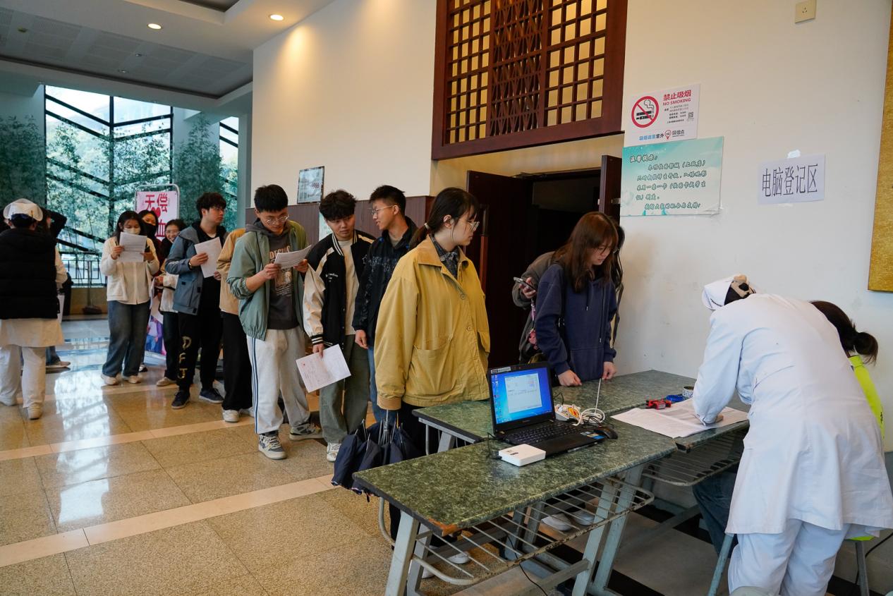 天马讲堂外,参加献血的师生在现场志愿者的引导下有序排队等候,依次在登记区、体检区、写卡区完成个人信息登记、健康体检等流程。