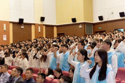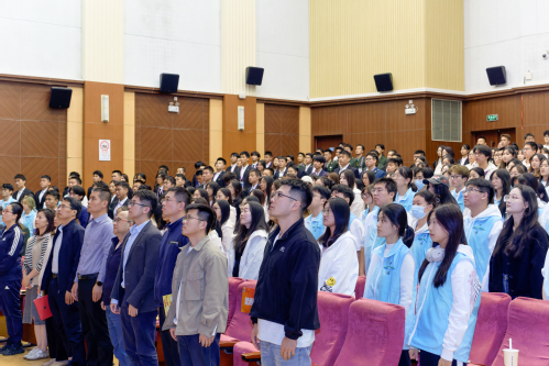 学生工作部、人民武装部部长丁永建为我校第七届进博会志愿者出征授旗,志愿者代表们接过旗帜并庄严宣誓,响彻馆内的铮铮誓言展现了全体志愿者为进博贡献青春力量的坚定信念。