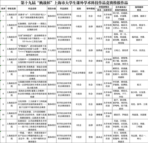 根据团中央和团市委相关通知要求,校团委牵头组织开展了2025年第十九届“挑战杯”上海市大学生课外学术科技作品竞赛,经过项目申报、资料审核、院级初审推荐、校级初赛复审、决赛等环节,根据校赛决赛校外专家评审打分排序,拟推荐以下12件作品参加“挑战杯”市级竞赛,按照要求,现将推荐作品的相关信息公示如下: