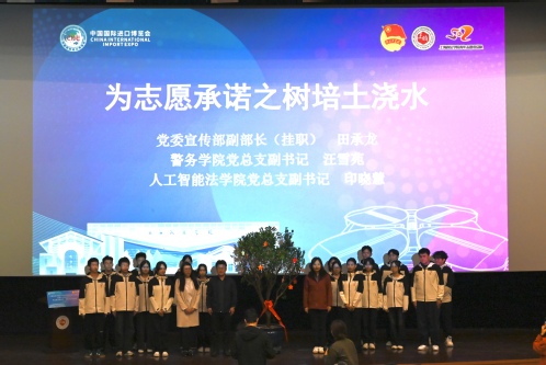 仪式上,校有关部门负责同志分别宣读了第八届进博会志愿者临时党、团组织成立文件,并为党员先锋队和团员突击队授予专属徽章。全体志愿者庄严宣誓并配挂志愿承诺卡片,领导嘉宾与志愿者代表共同为“志愿承诺之树”浇水培土。现场气氛庄重热烈,这份庄重的仪式感不仅是一种责任的承诺,更是上政青年投身国家重大活动的精神传承。