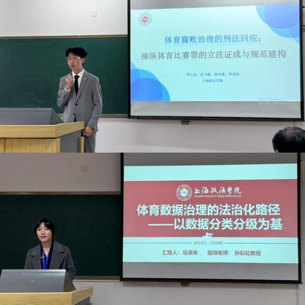会议设置“《体育法》与中国体育治理现代化”“体育法治理论探讨”“体育纠纷多元治理”“体育刑法规制”“国际体育法治”“体育‘饭圈’治理”六大专题研讨版块。我校学者深度参与各项议程:关保英教授担任大会主旨报告与谈人,姜熙教授以《体育法学:学科证成与分支体系建构》为题作大会主旨报告,系统论证了体育法学的独立学科地位。谭小勇教授主持分会场研讨,向会英教授担任分会场评议人。学术分论坛报告环节,硕士研究生马泽坤以《体育数据分类分级的法治化探索》为题发言,将数据分类分级作为探索体育数据治理的法治化路径出发点,立足体育数据人格权与财产权的双重属性,结合场景化应用提出体育数据分类分级的治理路径。本科生李仁杰围绕《体育腐败治理的刑法回应:操纵体育比赛罪的立法证成与规范建构》进行汇报,从应罚性和需罚性系统论证操纵体育比赛罪的立法正当性,并提出规范建构设想。