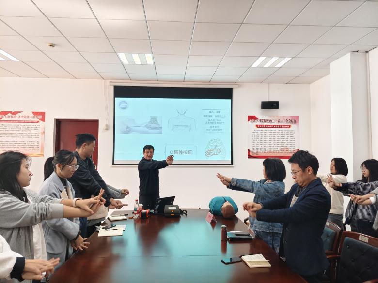 在实操演示环节,王新翔老师还就急救程序、心肺复苏(CPR)的操作流程、自动体外除颤器(AED)的使用等实用知识进行了现场讲解与演示,并让部分师生亲身体验心肺复苏流程,加深对心肺复苏步骤及操作要点的记忆。在专业指导下,姜熙院长、向会英副院长以及现场多位师生纷纷踊跃参与,亲身体验。现场气氛热烈,实操环节极大地提升了活动的参与感和实效性。