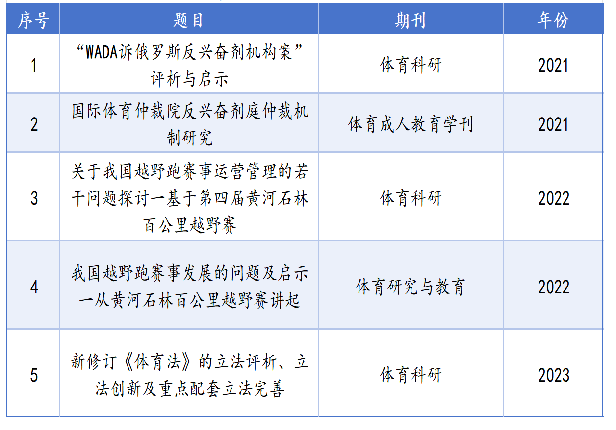 体育法学类课程:体育法学、国际体育法、体育仲裁、模拟体育仲裁庭、反兴奋剂法律理论与实践等。