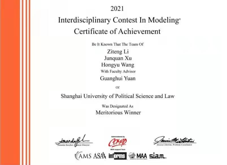 2021年美国(国际)大学生数学建模竞赛(MCM/ICM)成绩日前揭晓,我校经济管理学院继在2020年度赛事中取得一等奖后再创佳绩,斩获了一等奖(Meritorious Winner)1项、三等奖(Successful Participant)9项,创下我校历年来在该赛事中斩获国际奖项数量之最。