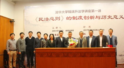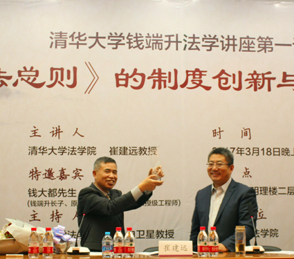 2017年3月18日晚七点,清华大学法学院明理楼模拟法庭以热烈的气氛迎来了钱端升法学系列讲座第一场:“《民法总则》的制度创新与历史意义”。本次讲座由清华大学法学院崔建远教授主讲,法学院院长申卫星教授主持,并由钱端升先生的长子、原国土资源部副司长、教授级工程师钱大都先生致辞。清华大学法学院院副院长崔国斌、法学院院副院长邓海峰,以及民法学科的耿林、龙俊、汪洋等老师也参加了本次讲座。