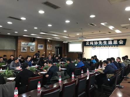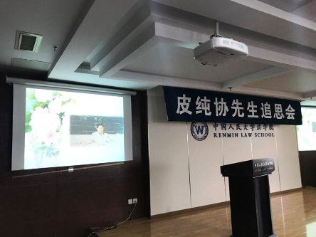 皮纯协先生追思会于10月22日上午在中国人民大学明德法学楼601国际学术报告厅举行。皮纯协教授的女儿皮淑君、儿子皮大勇、女婿孙健、侄孙傅国洪等亲属,皮老师生前的学生与好友,包括北京大学姜明安教授,中国社会科学院政治学研究所副所长冯军教授,国家法官学院王雅琴教授,国家行政学院任进教授,中国政法大学刘莘教授、王万华教授、王敬波教授,中国人民大学公共管理学院刘太刚教授、王丛虎教授,曾在人大法学院求学、工作的王嘉杰律师、北京市天铎律师事务所主任胡维翊律师、北京银保信基金公司刘飞宇律师,中国人民大学法学院党委书记林嘉教授、副院长张翔教授,宪法与行政法教研室韩大元教授、杨建顺教授、李元起教授、王旭教授,以及法学院许多师生参加了追思会。