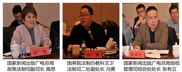 本次立法专家咨询会受到了中央有关部门的高度重视和大力支持。国家新闻出版广电总局政策法制司高思副司长介绍了《著作权法(修订草案送审稿)》的立法背景和主要考虑。国务院法制办教科文卫法制司二处冯勇副处长在研讨会结束时对专家学者的发言进行了简要回应。国家新闻出版广电总局版权管理司综合处张有立处长、政策法制司张洁,国务院法制办教科文卫法制司杨帆参加了会议。