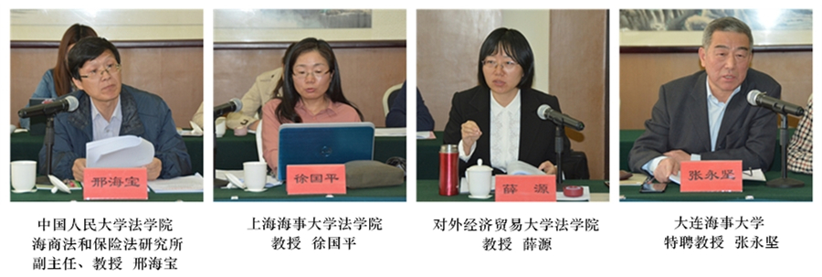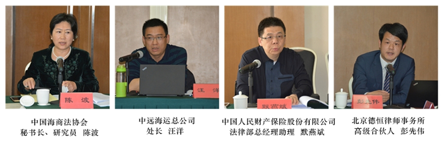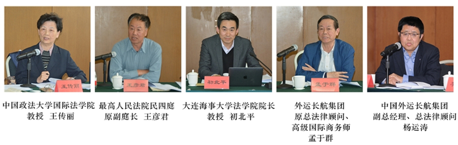 中国国际法学会常务理事、中国政法大学国际法学院教授王传丽,最高人民法院民四庭原副庭长王彦君,中国海商法协会副秘书长、大连海事大学法学院院长、教授初北平,中国海商法协会顾问、外运长航集团原总法律顾问、高级国际商务师孟于群,中国外运长航集团副总经理兼总法律顾问杨运涛,中国海商法协会常务理事、清华大学法学院教授傅廷中,中国法学会民法学研究会副秘书长、中国社科院法学研究所民法研究室副主任、研究员朱广新,长江海商法学会副秘书长、武汉大学法学院教授张辉,北京大学法学院教授郭瑜,中国人民大学法学院海商法和保险法研究所副主任、教授邢海宝,上海海事大学法学院教授徐国平,中国法学会国际经济贸易法学研究会理事、对外经济贸易大学法学院教授薛源,中国远洋运输总公司原董事会秘书、大连海事大学特聘教授张永坚,中国海事仲裁委员会副秘书长兼仲裁院副院长、中国海商法协会秘书长、研究员陈波,中远海运总公司处长汪洋,中国人民财产保险股份有限公司法律部总经理助理默燕斌,北京德恒律师事务所高级合伙人彭先伟律师等相关领域的知名专家学者参加会议。