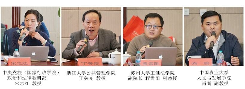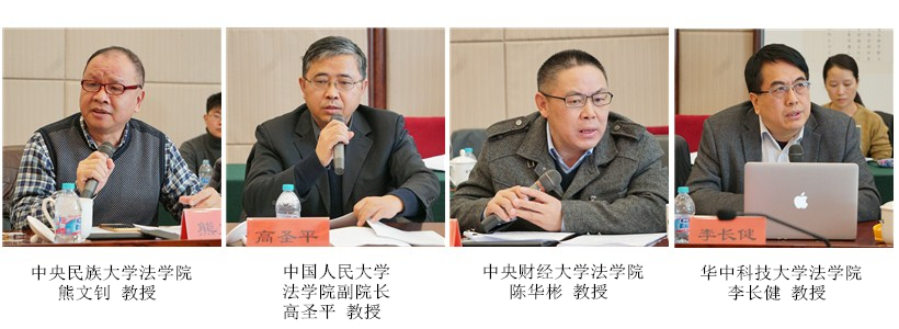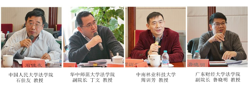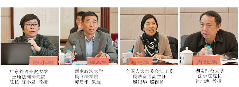 中国法学会民法学研究会副会长、广东外语外贸大学土地法制研究院院长陈小君教授,中国法学会民法学研究会副会长、西南政法大学民商法学院谭启平教授,全国人大常委会法工委民法室原副主任扈纪华巡视员,湖南师范大学法学院院长肖北庚教授,中国法学会立法学研究会副会长、中央民族大学法学院熊文钊教授,中国人民大学法学院副院长高圣平教授,《财经法学》主编、中央财经大学法学院陈华彬教授,华中科技大学法学院李长健教授,中国人民大学法学院石佳友教授,华中师范大学法学院副院长丁文教授,中国法学会环境资源法学研究会常务理事、中南林业科技大学周训芳教授,广东财经大学法学院副院长鲁晓明教授,中央党校(国家行政学院)政治和法律教研部宋志红教授,浙江大学公共管理学院丁关良教授,苏州大学王健法学院副院长程雪阳副教授,中国农业大学人文与发展学院肖鹏副教授等相关领域的知名专家学者参加会议并发表修改建议。中国法学会民法学研究会副会长、中国人民大学法学院杨立新教授,中国政法大学民商经济法学院李蕊教授,烟台大学法学院张平华教授提交了书面意见。