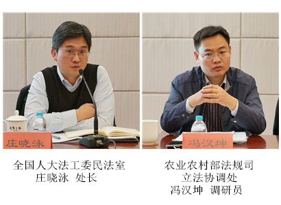 本次立法专家咨询会受到了中央有关部门的高度重视和大力支持。全国人大法工委民法室庄晓泳处长,农业农村部法规司立法协调处冯汉坤调研员参加了研讨会。会议开始后,庄晓泳处长介绍了《农村土地承包法修正案(草案二次审议稿)》的修法背景和主要考虑。