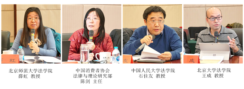 全国人大代表、中国法学会民法学研究会常务副会长、中国社科院学部委员、法学研究所孙宪忠研究员,中国法学会民法学研究会学术委员会副主任、烟台大学法学院郭明瑞教授,中国法学会民法学研究会副会长、复旦大学法学院刘士国教授,中国法学会民法学研究会副会长、中国社科院法学研究所谢鸿飞研究员,北京师范大学法学院薛虹教授,中国消费者协会法律与理论研究部陈剑主任,中国人民大学法学院石佳友教授,北京大学法学院王成教授,北京航空航天大学法学院副院长周友军教授,中国人民大学法学院竺效教授,北京市第一中级人民法院民二庭丁宇翔副庭长,北京航空航天大学法学院李昊副教授等相关领域的知名专家学者参加会议并发表修改建议。中国法学会民法学研究会副会长、中国人民大学法学院杨立新教授,中国法学会国际经济法学研究会副会长、对外经济贸易大学法学院王军教授,四川大学法学院王竹教授提交了书面意见。