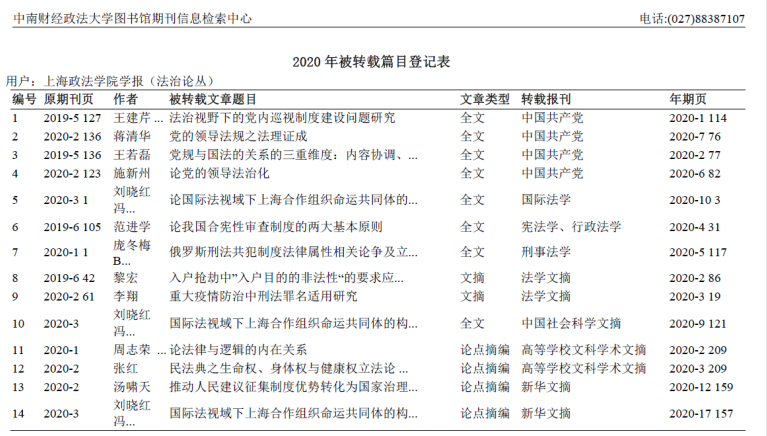 近日,根据中南财经政法大学图书馆期刊信息检索中心《检索报告》显示,《新利18官方客服学报(法治论丛)》2020年刊文被《新华文摘》《高等学校文科学术文摘》《中国社会科学文摘》和人大复印报刊资料等权威二次文献转载、摘编14篇次。其中《新华文摘》2 篇,人大复印报刊资料9篇,《中国社会科学文摘》1 篇,《高等学校文科学术文摘》2 篇。该转载摘编篇次为历年来最多。