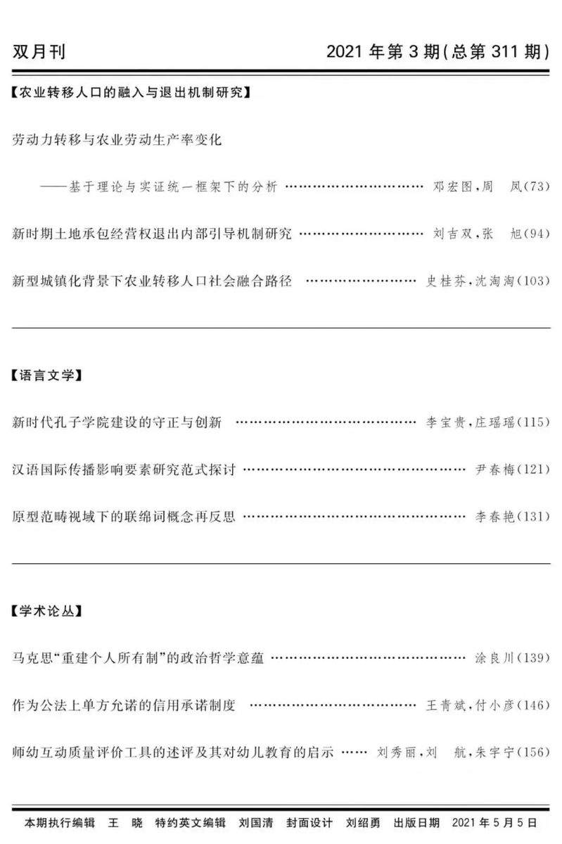 [原刊信息] 邓宏图,周凤.劳动力转移与农业劳动生产率变化——基于理论与实证统一框架下的分析[J].东北师大学报(哲学社会科学版),2021(03):73-93.