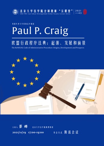 2021年11月19日,北京大学法学院全球教席学者、英国牛津大学荣休法学教授Paul P. Craig以“欧盟行政程序法典:起源、发展和前景”为题开展了一场线上学术讲座,讲座由北京大学法学院助理教授彭錞主持,北京大学法学院教授沈岿、中国政法大学诉讼法学研究院教授王万华担任评议人,百余名校内外师生通过腾讯会议平台在线参与讲座,反响热烈。