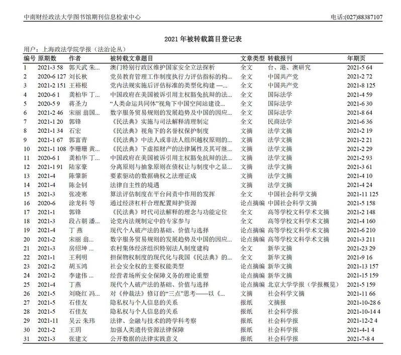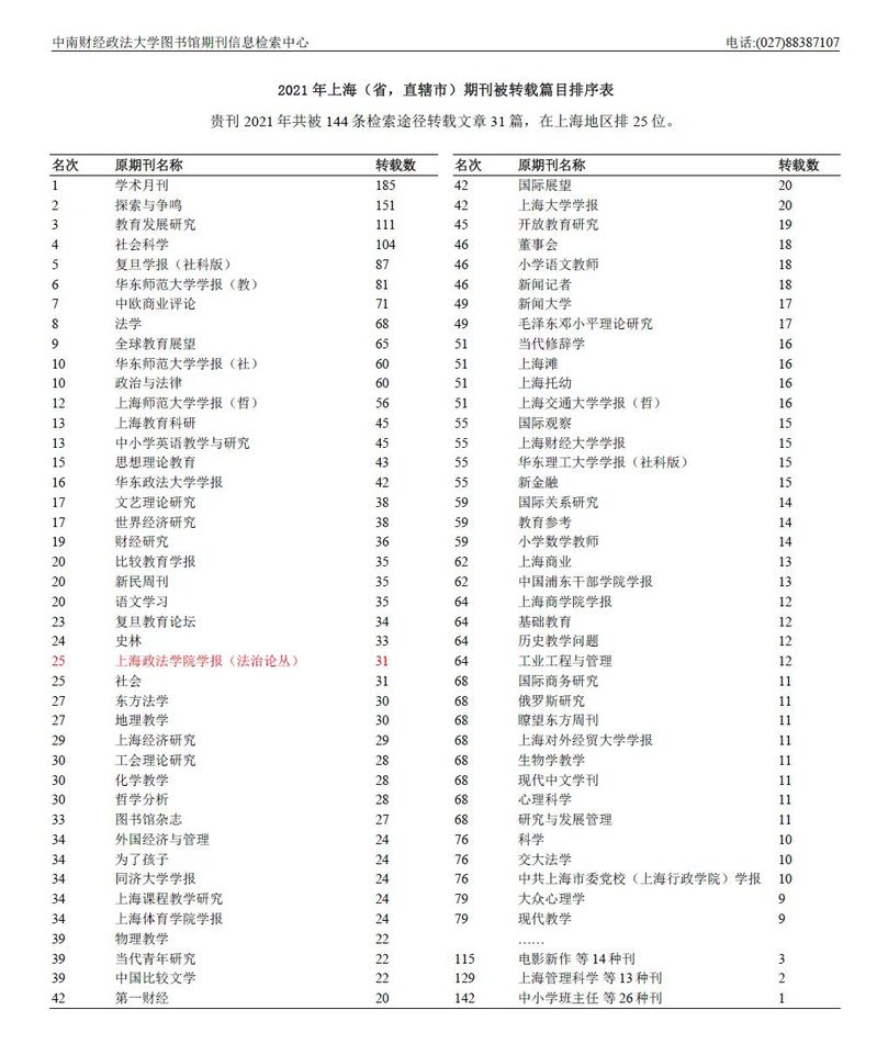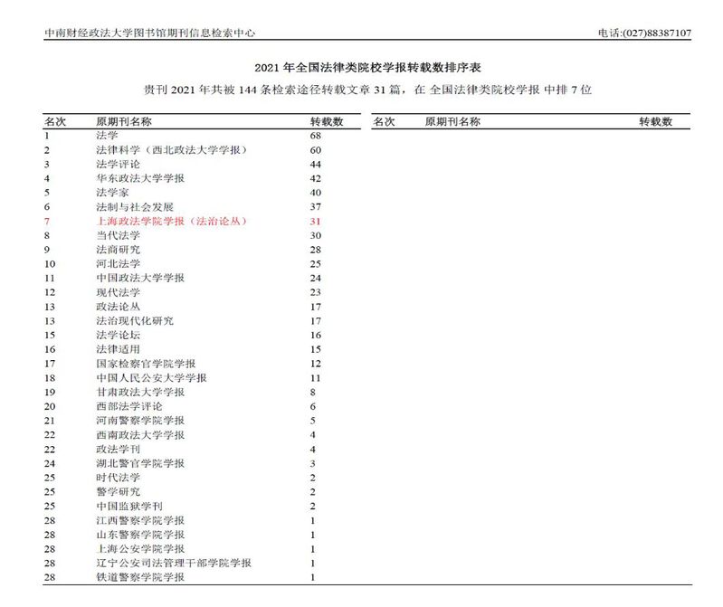 《检索报告》显示,我校学报2021年共被144条检索途径转载文章31篇,在全国法律类院校学报中排7位,在上海地区排25位。