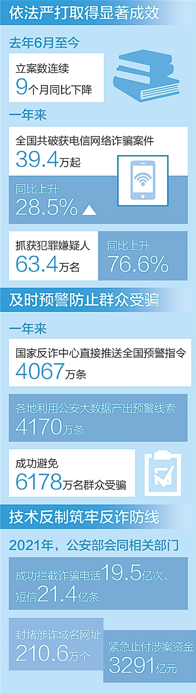 据介绍,全国公安机关深入开展“云剑”“长城”“断卡”“断流”“5·10”等专项行动,先后组织开展150次全国集群战役。一年来,共破获电信网络诈骗案件39.4万起,抓获犯罪嫌疑人63.4万名,同比分别上升28.5%和76.6%。根据最新统计,电信网络诈骗立案数连续9个月同比下降,打击治理工作取得显著成效。