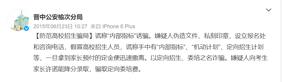 每年各省市投档分数线公布后,总是“几家欢喜几家愁”,不法分子也在此刻瞄准了落榜考生。根据各地公安部门通报,一些不法分子假冒高校招生人员或声称“熟悉”高校招生办,点对点与相关考生取得联系。随后谎称有某高校的“内部指标”“机动计划”,或是以“定向招生”“委培招生”等名义“降分录取”考生,诱骗其缴纳相关费用。需要注意的是,在实施这些诈骗行为时,不法分子往往使用电脑合成技术伪造“招生文件”“学校公章”等,骗取考生及家长的信任。